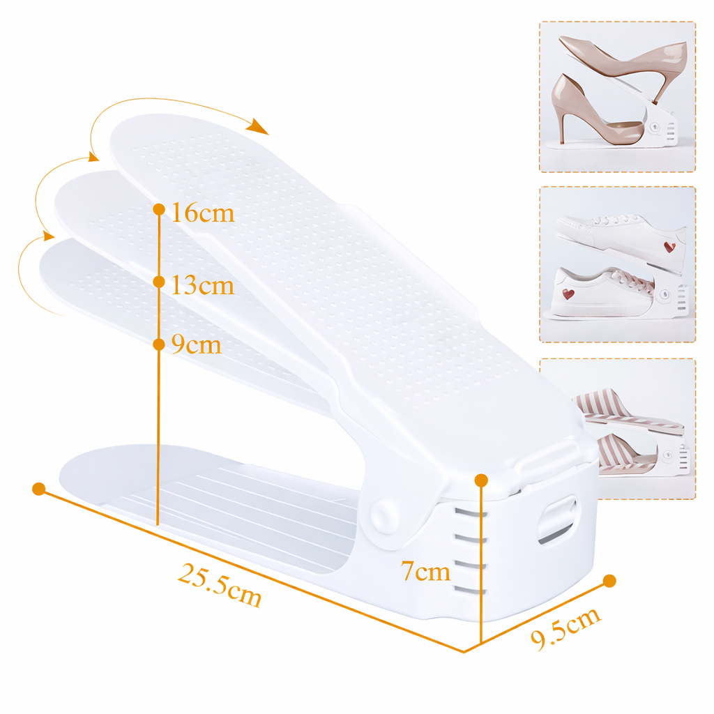 Cada unidad está diseñada para organizar un par: un zapato se coloca en la base inferior y el otro en la parte superior inclinada. De esta forma, ocupás menos espacio horizontal y mantenés tus pares mejor acomodados.