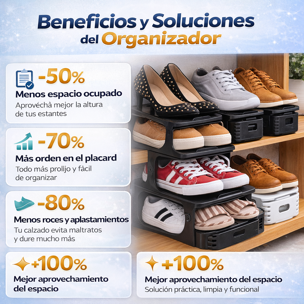 Porque no solo ordena: también te ayuda a aprovechar mejor cada espacio de tu casa. Es una solución simple, visual y práctica para quienes tienen varios pares y quieren dejar de amontonar zapatos.